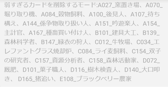 弱カード排除ルールとは、ゲーム開始時のオプションで弱いカードをドラフトで出現させなくさせるルールのこと。ルールを設定することで、上記のカードはドラフトで出現しなくなる。